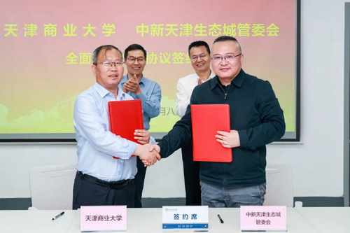 在张亚、王国良的见证下,陈冠益与杨勇签署天津商业大学与中新天津生态城全面战略合作协议。