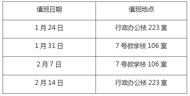 一、1月15日至2月20日期间,每周周三上午8:30至12:00安排专人值班。2月21日起恢复正常上班时间。具体日期如下: